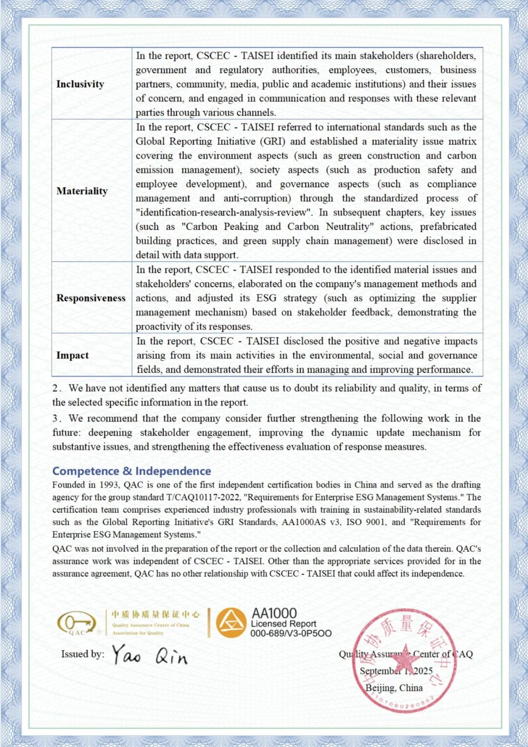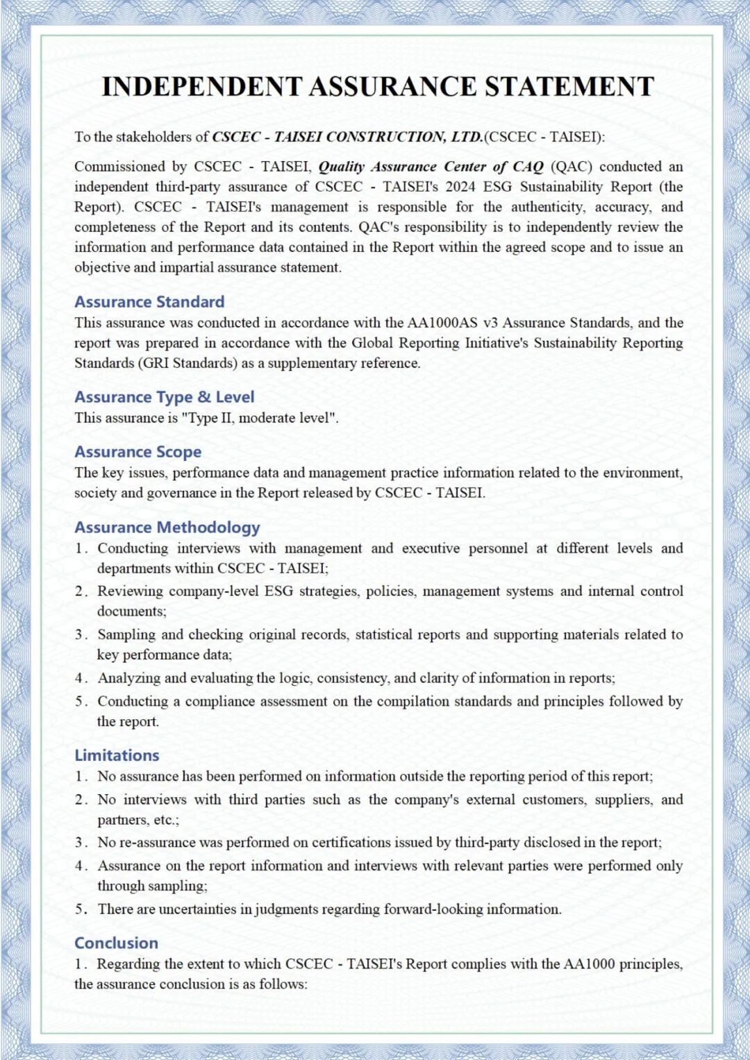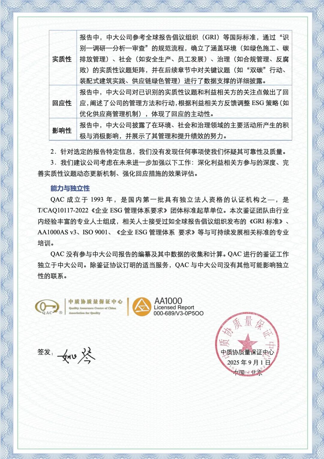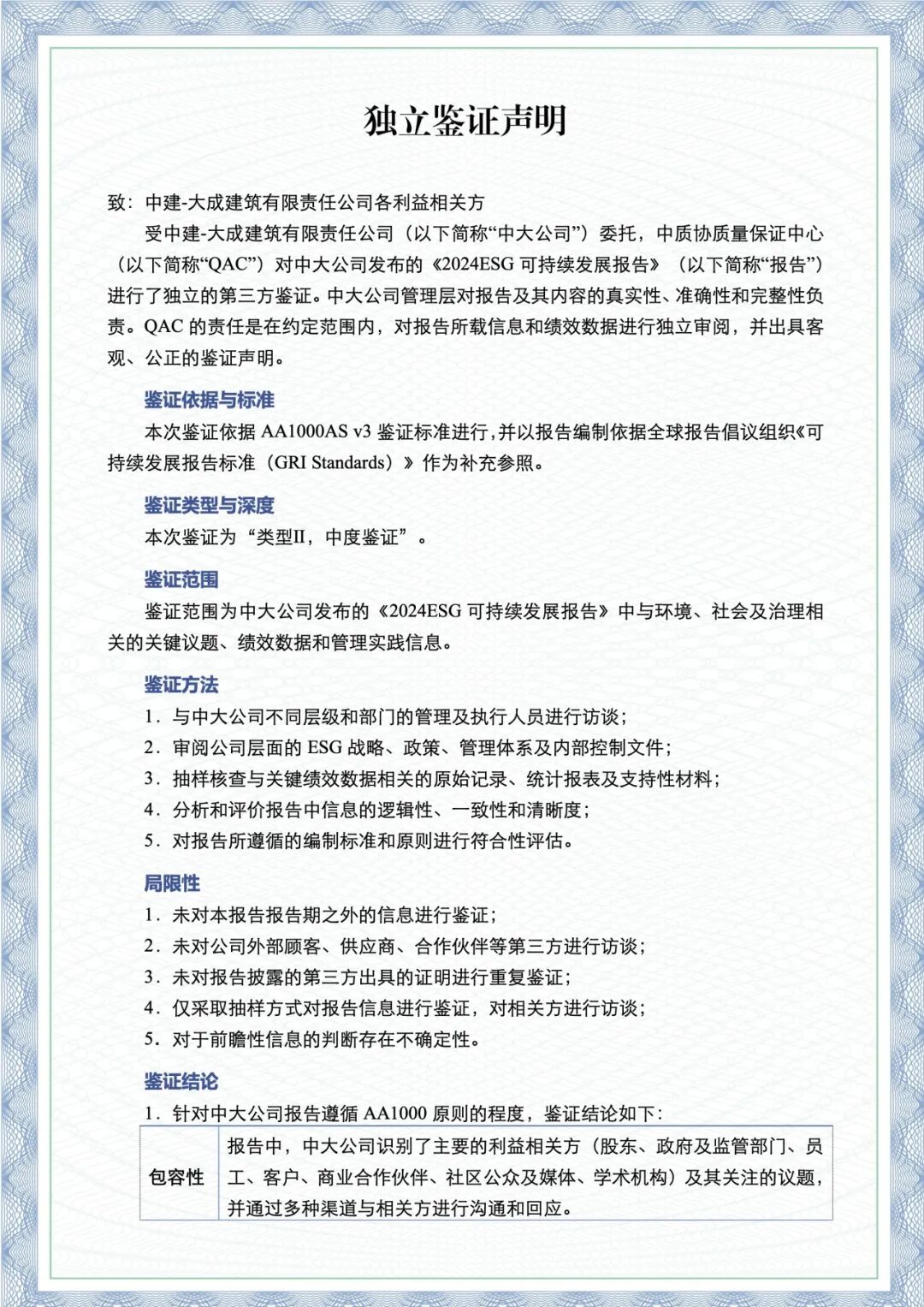 最终独立鉴证声明确认:中大公司《2024年度ESG可持续发展报告》在包容性、实质性、回应性方面均符合AA1000原则要求。